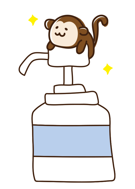 消毒液を全体重で押すサル