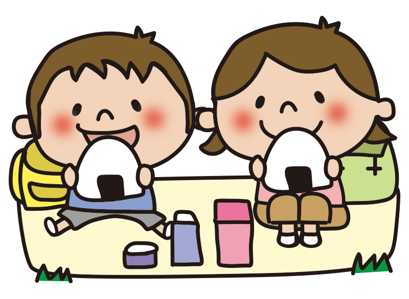 遠足でおにぎりを食べる子供たち