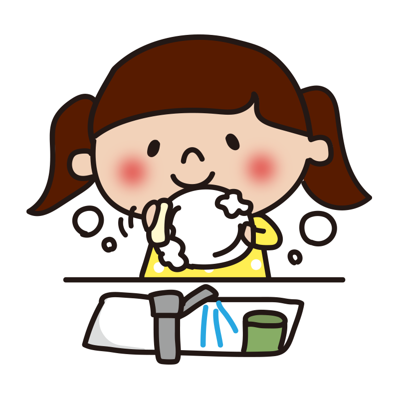 水を出しながらお皿洗いをする子供(女の子)