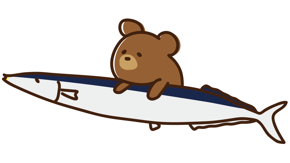 秋の味覚の秋刀魚に乗っているクマです。新鮮な秋刀魚なので口先が黄色くなっています。