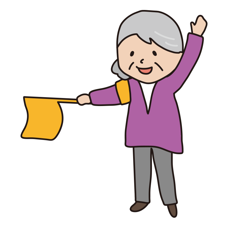 手をあげて横断歩道を渡る子供たちと旗振りをする男性1