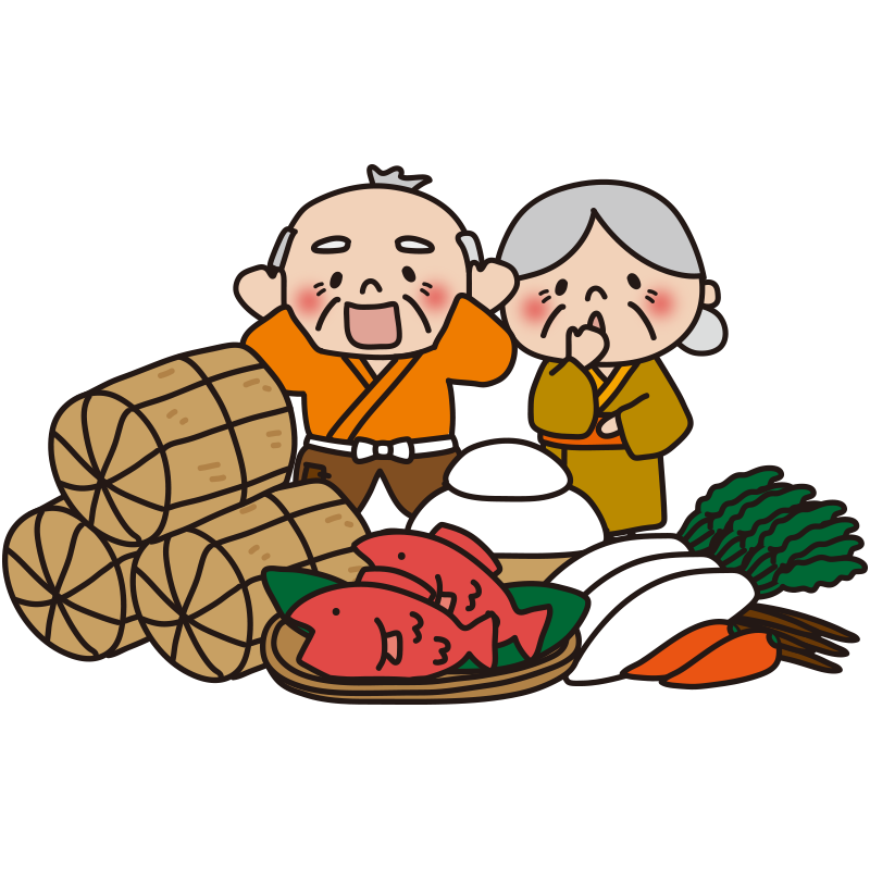 お米や野菜やお餅にびっくりするおじいさんとおばあさん