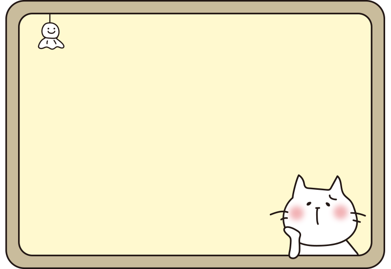 HOME枠 てるてる坊主を飾って窓から顔を出す白い猫の枠(横) 2023年5月26日 枠 てるてる坊主を飾って窓から顔を出す白い猫の枠(横) てるてる坊主を飾って窓から顔を出す白い猫の枠(縦) 歌う白い猫1