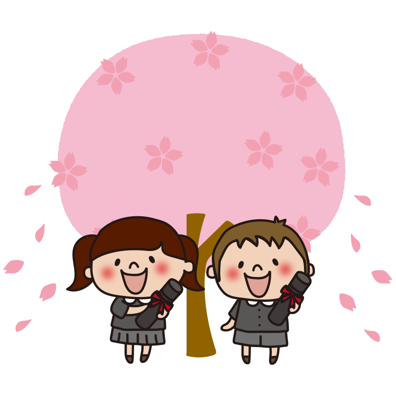 桜の木の前で卒業証書を持っている子供たち1