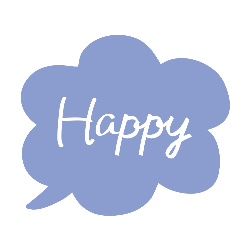 ふわふわの吹き出しの中にハッピーの文字(青)