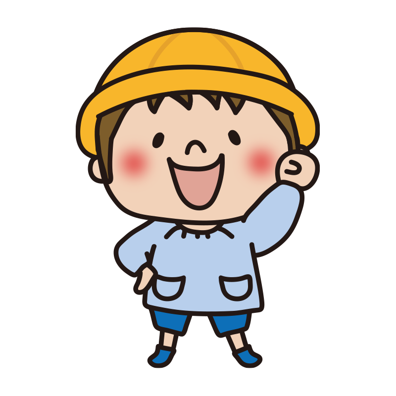 通園帽子をかぶってガッツポーズをするスモックを着た幼稚園児(男の子1)
