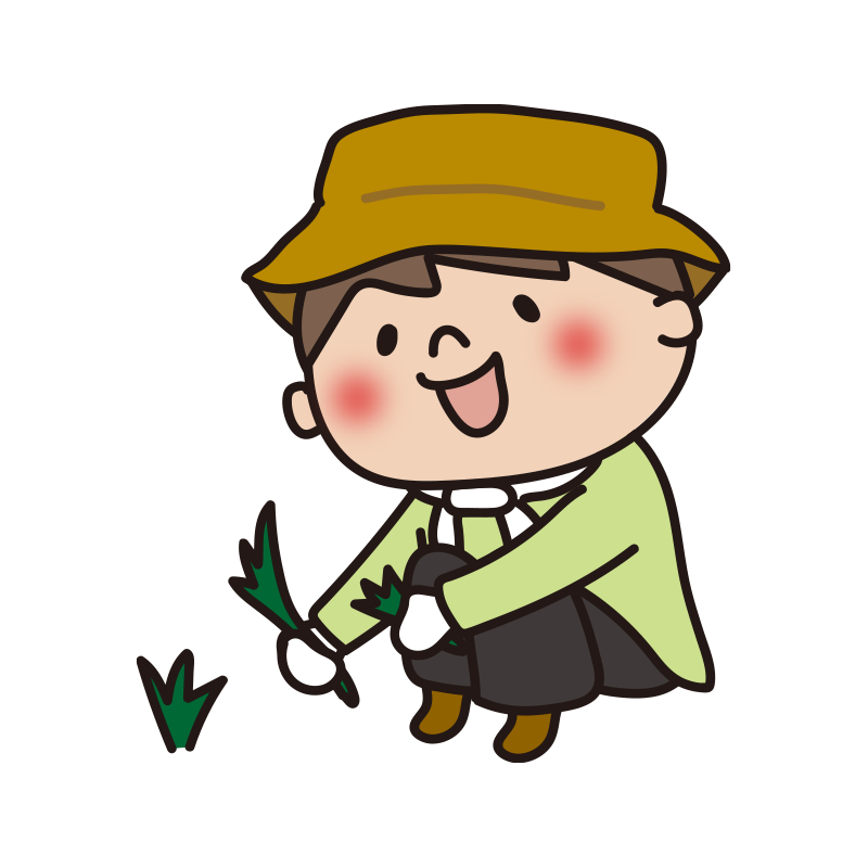 帽子を被って草むしりをする子供(男の子)