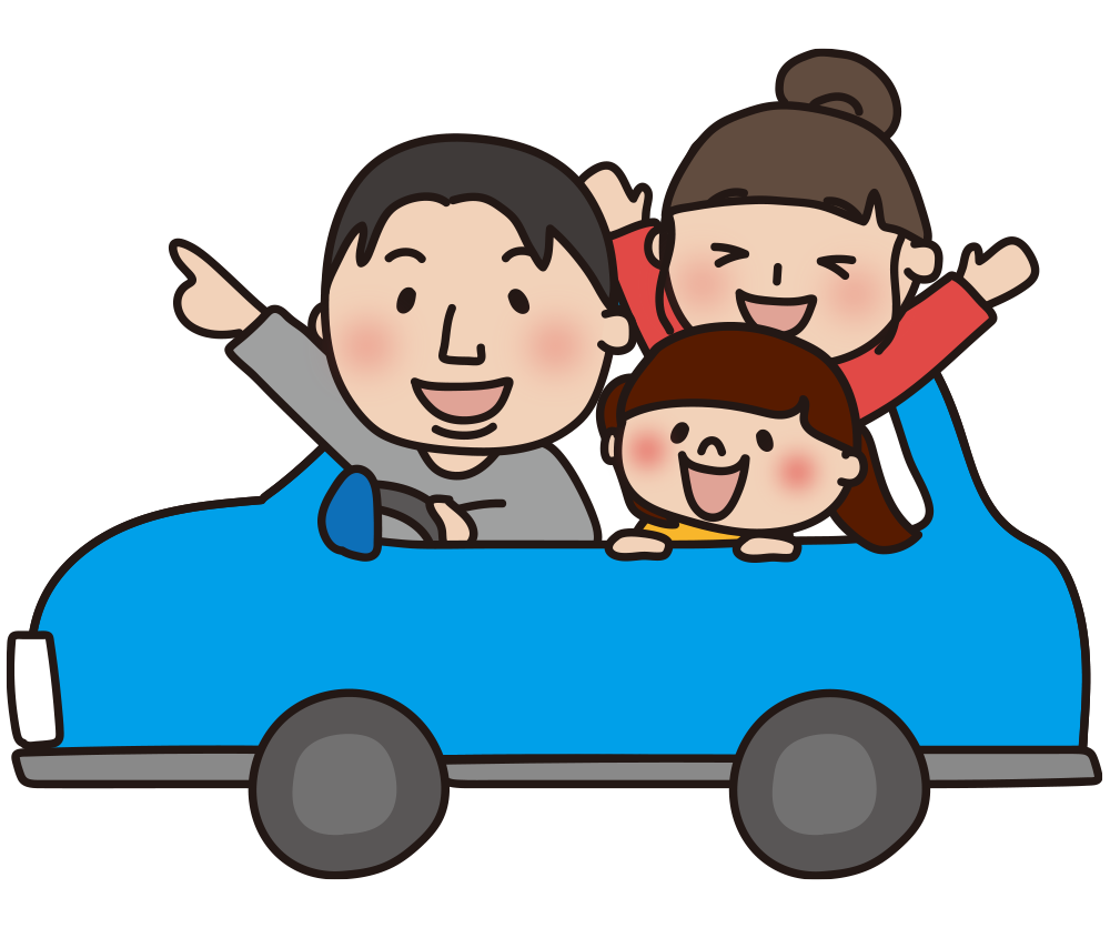 青い車でドライブする家族(横)