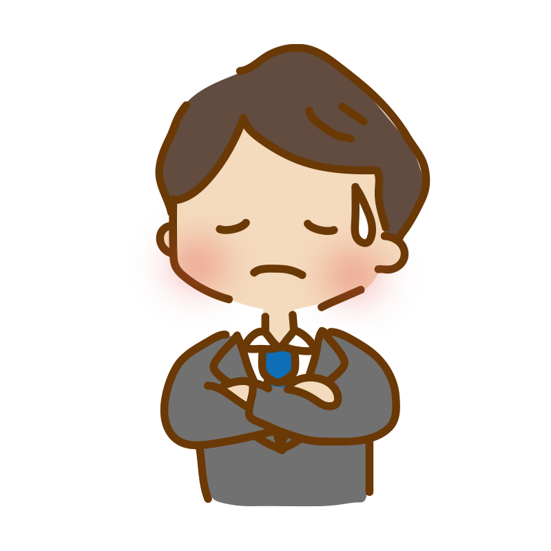 腕を組んで考えているゆるくて可愛いスーツの男性