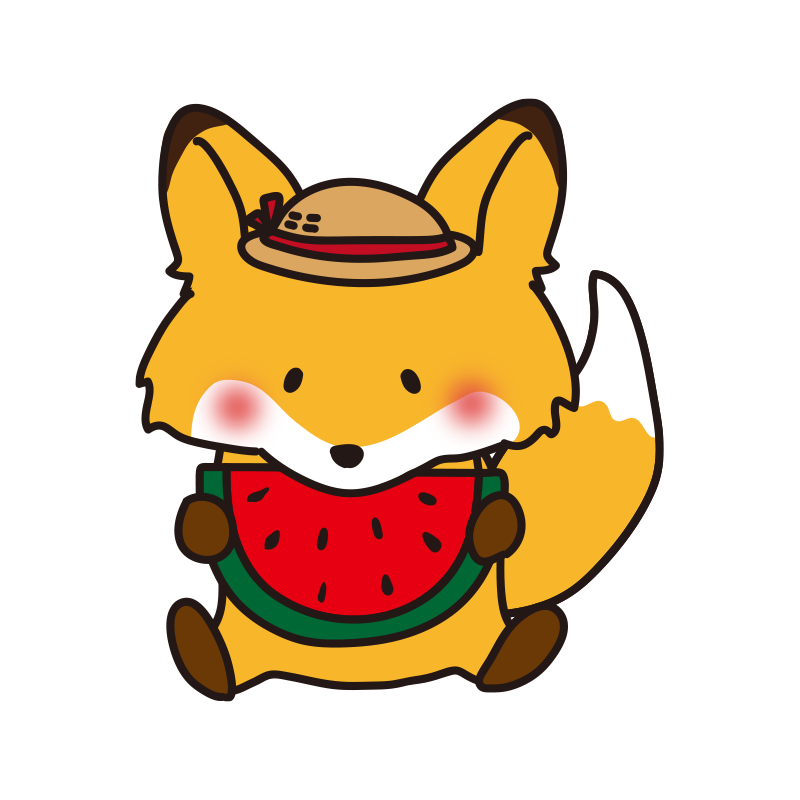 夏に麦わら帽子をかぶってスイカを食べているキツネ
