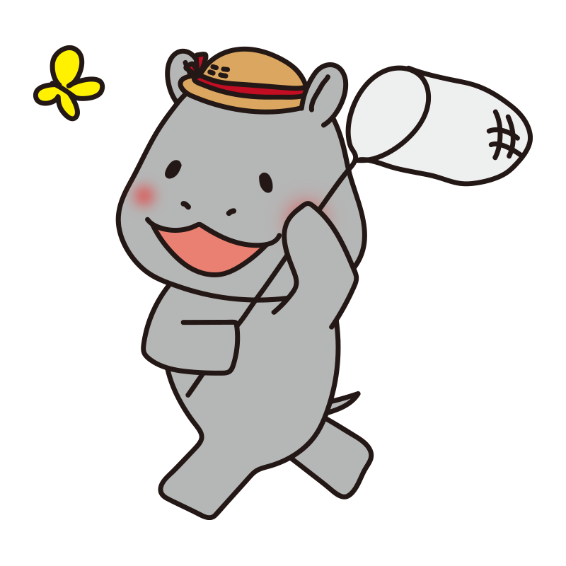 虫取り網で蝶を追いかけるカバ