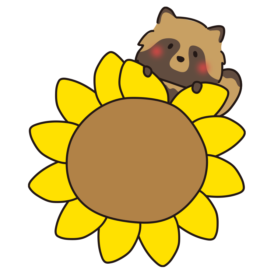 文字が書けるくらい大きなヒマワリに乗ったタヌキ