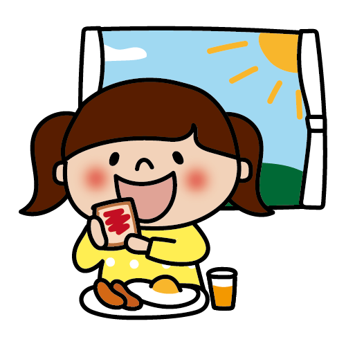 窓の前で洋食の朝ごはんを食べる子供(女の子2)