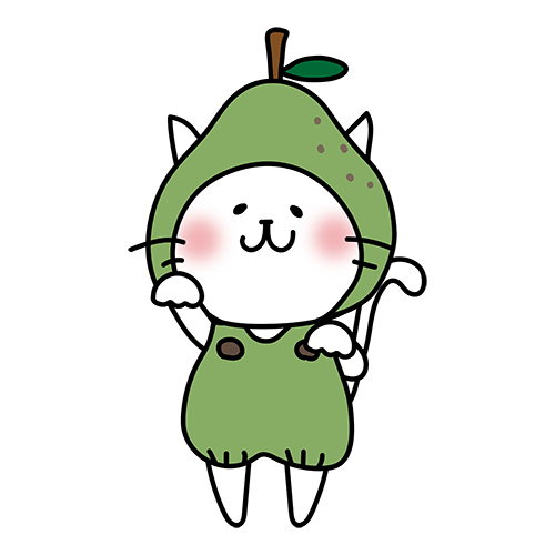 洋ナシのかぶり物をしている白い猫