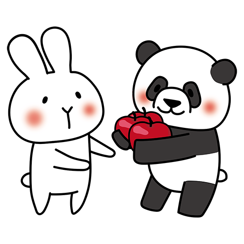 白いうさぎに果物を渡すパンダ