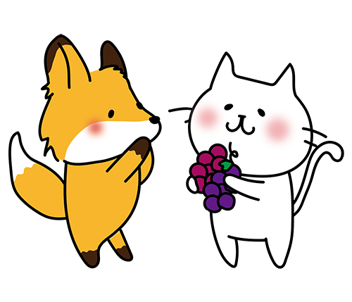 キツネに果物を渡す白い猫
