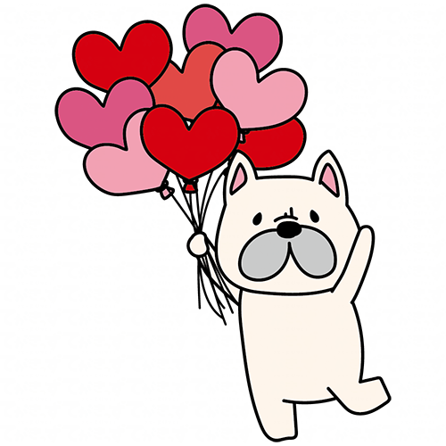 ハートの赤い風船の束を持っているフレンチブルドッグ