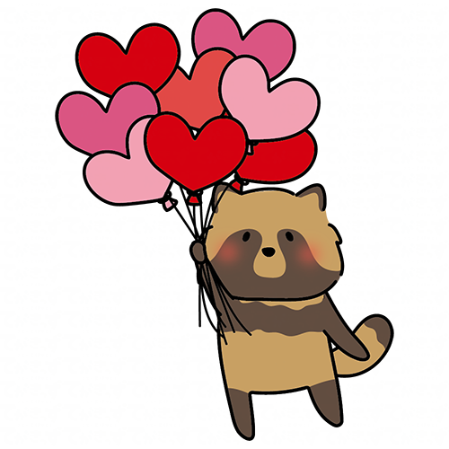 ハートの赤い風船の束を持っているタヌキ