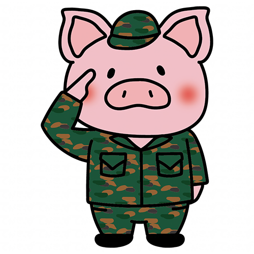 迷彩服を着て敬礼するぶた