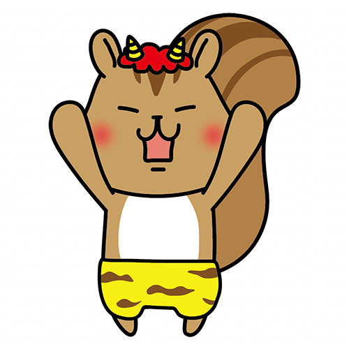 ガォーと脅かしている赤鬼の格好をしたリス