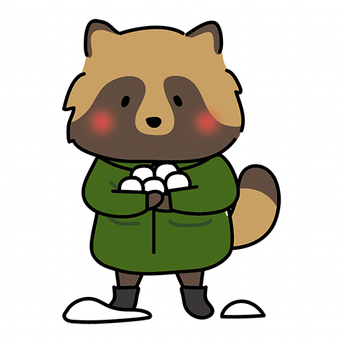 冬服で雪合戦の雪玉をつくるタヌキ