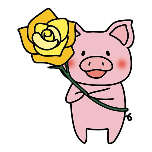 黄色い大きなバラを持っているぶた