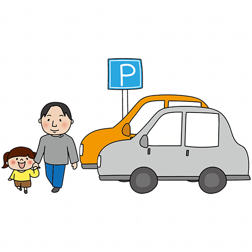 駐車場で手を繋いで歩く娘とパパ