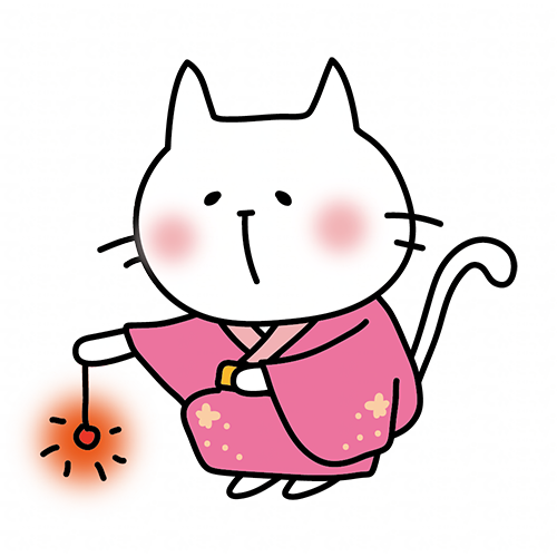 ピンクの浴衣を着て線香花火をする白い猫