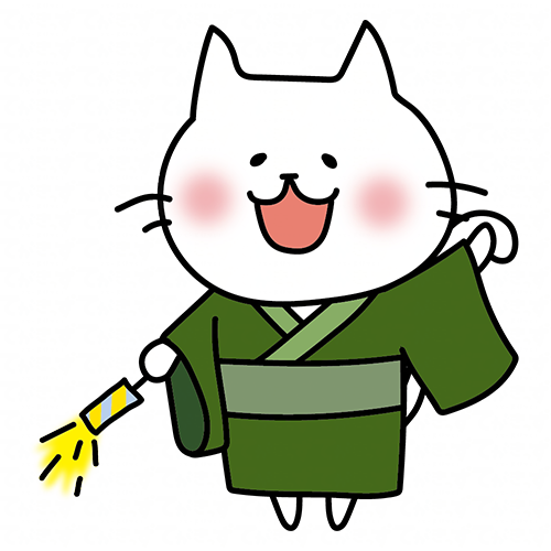 緑の浴衣を着て線香花火をする白い猫