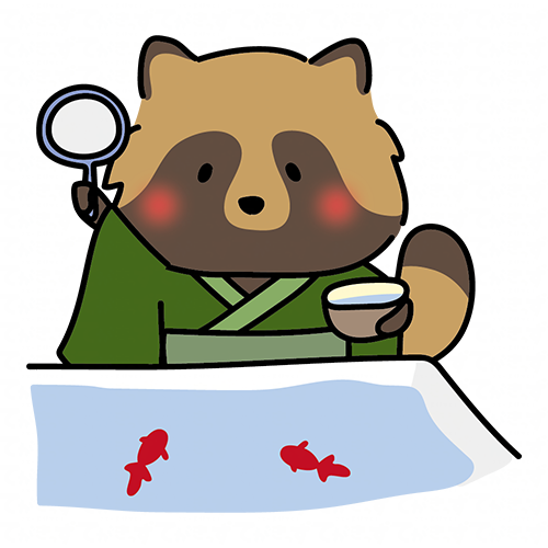 ピンクの浴衣を着て金魚すくいをするタヌキ