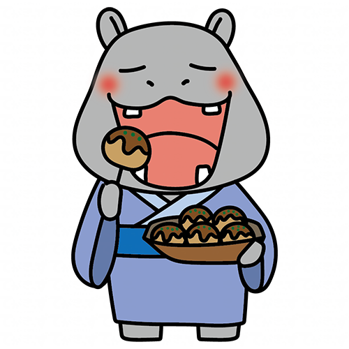 浴衣を着てたこ焼きを食べるカバ