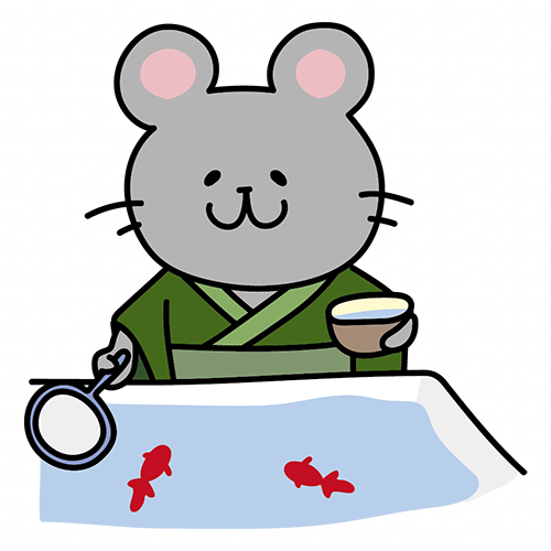 緑の浴衣を着て金魚すくいをするネズミ