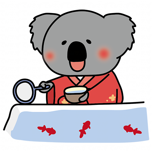 赤い浴衣を着て金魚すくいをするコアラ