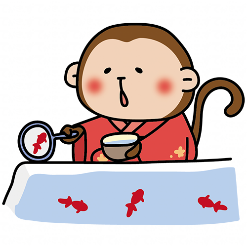 赤い浴衣を着て金魚すくいをする猿