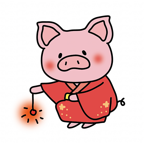 赤い浴衣を着て線香花火をするぶた