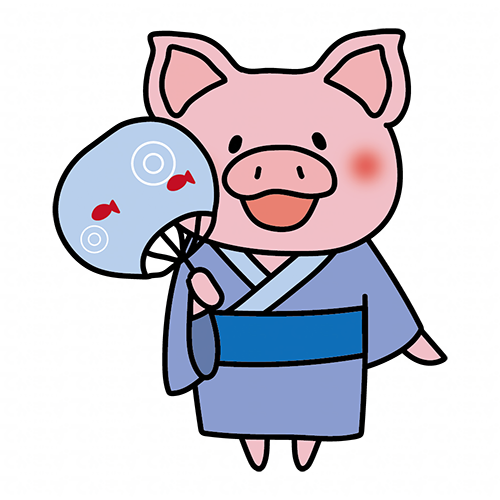 青い浴衣を着てうちわを持っているぶた