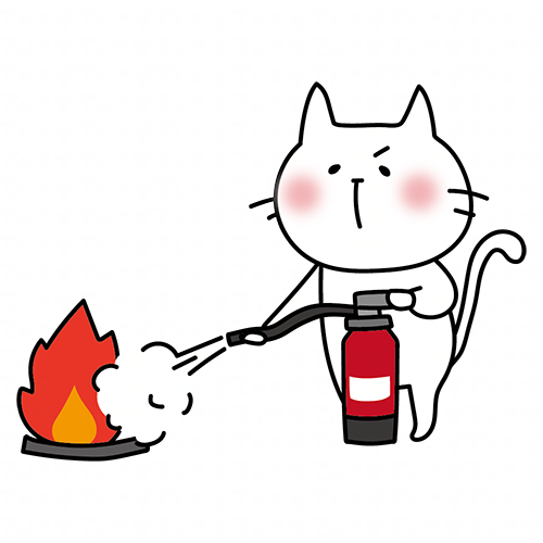 消火器を使って消火の練習をする白い猫