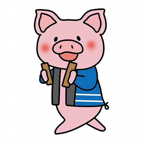 拍子木を持って火の用心の声掛けをしているぶた