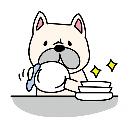 食器を拭くお手伝いをするフレンチブルドッグ