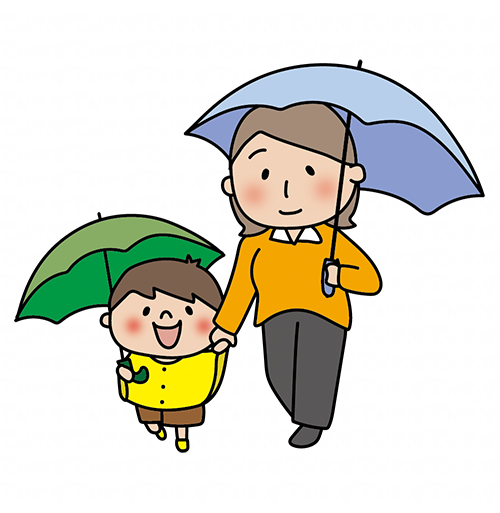 傘をさして手を繋ぐママと息子