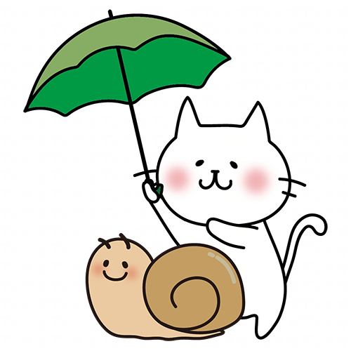 大きなかたつむりに傘をさす白い猫