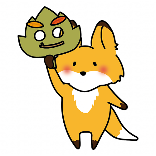 落ち葉のお面を持つキツネ