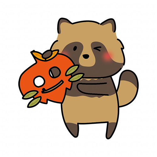 落ち葉のお面を持つタヌキ
